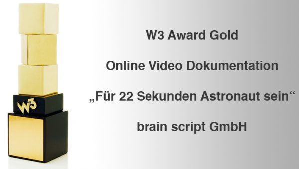 Mit der VR-360° Experience „Für 22 Sekunden Astronaut sein“ gewann brain script den W3 Award Gold in der Kategorie „Online Video Dokumentation“. Die Kurzdokumentation über Parabelflüge und die wissenschaftliche Forschung in der Schwerelosigkeit wurde für den deutsch-französischen Kultursender ARTE produziert. Mit dem VR-360° Video kann man selbst das Gefühl der Schwerelosigkeit nachempfinden, zumindest in der Virtual Reality. Die…