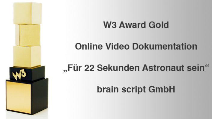 Mit der VR-360° Experience „Für 22 Sekunden Astronaut sein“ gewann brain script den W3 Award Gold in der Kategorie „Online Video Dokumentation“. Die Kurzdokumentation über Parabelflüge und die wissenschaftliche Forschung in der Schwerelosigkeit wurde für den deutsch-französischen Kultursender ARTE produziert. Mit dem VR-360° Video kann man selbst das Gefühl der Schwerelosigkeit nachempfinden, zumindest in der Virtual Reality. Die…